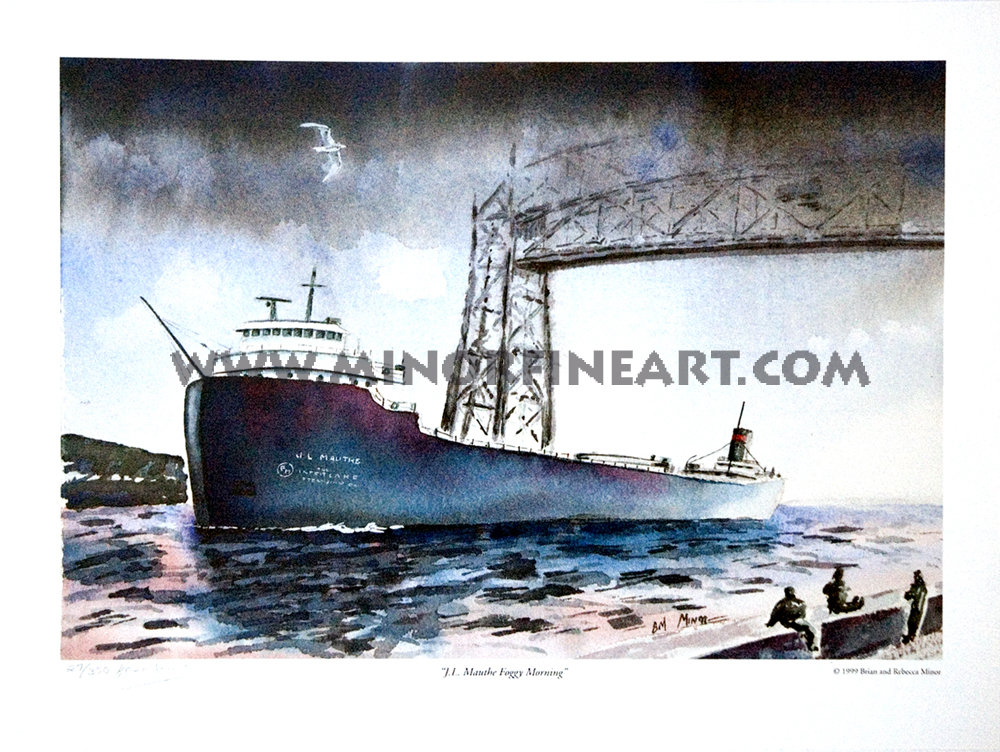 The Mauthe slips out of Duluth harbor on a foggy morning that enshrouds